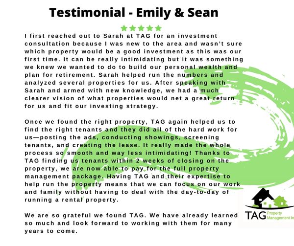 Once we found the right property, TAG again helped us to find the right tenants and they did all of the hard work for us—posting the ads, conducting showings, screening tenants, and creating the lease. It really made the whole process so smooth and way less intimidating! Thanks to TAG finding us tenants within 2 weeks of closing on the property, we are now able to pay for the full property management package. Having TAG and their expertise to help run the property means that we can focus on our work and family without having to deal with the day-to-day of running a rental property.