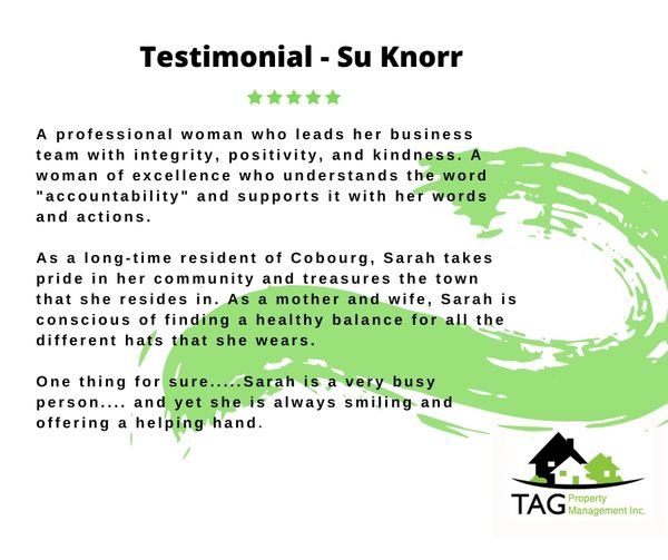 Sarah’s actions have a wide, positive reach. Her businesses provide employment for many locals. Her real estate investing provides safe, legal housing for tenants. Sarah’s property management company helps other real estate investors give their tenants the best-renting experience they can have. I personally own 12 apartments in the town of Cobourg, and I trust Sarah and her team to take care of my properties and tenants. "